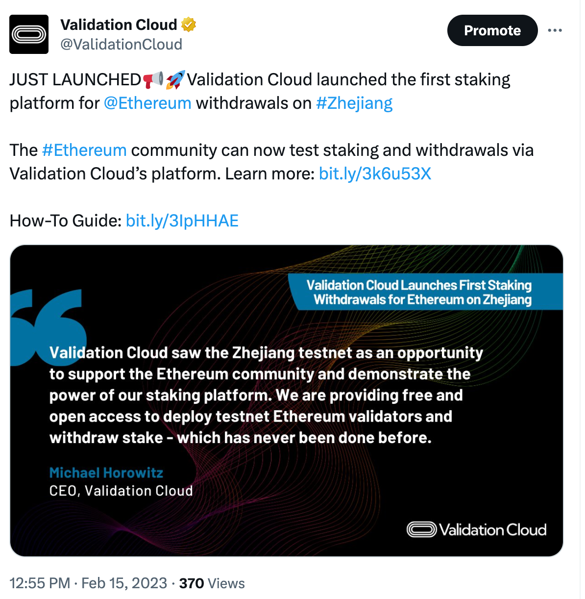 In February, Validation Cloud’s staking team, led by Mo Husseini, launched the first withdrawal functionality on ETH via Zhejiang Testnet. This allowed the Ethereum community to test staking and withdrawals via Validation Cloud’s platform, and added to Validation Cloud’s bona fides in ETH staking and related product velocity. As we will highlight later, this would set the foundation for the company’s further breakthrough innovations in ETH staking.